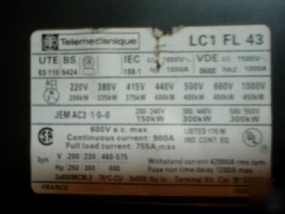 New Telemecanique Motor Contactor 600V/900A continuous current. Complete with data sheet, hardware. Still in original factory shrink wrap. Data plate photo is a bit blurry, but it has all the information (taken off one of our used models). Includes 110-120V coil and auxiliary contact block. Email us with any questions you may have. LIST PRICE IS: $6000.00+