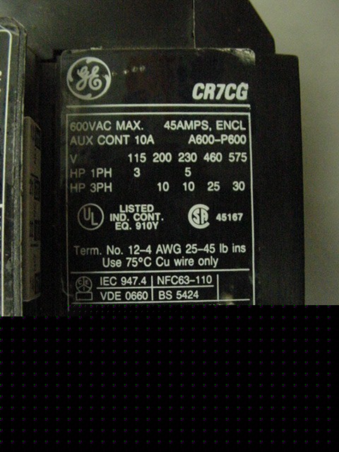 GE CR7CG Contactor 3Pole 72Amp 37/45Amp 600VAC 190-208V